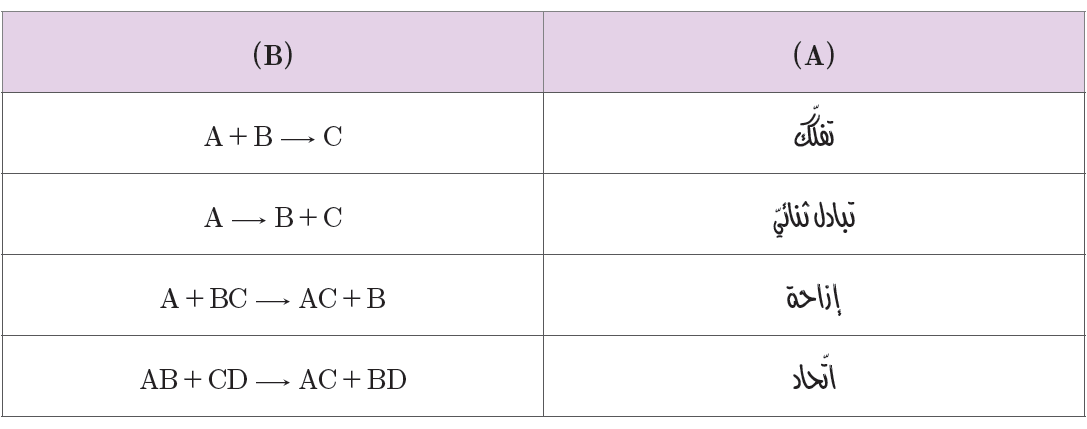 صِل بين نوع التفاعل في القائمة (A) وما يناسبه في القائمة (B):