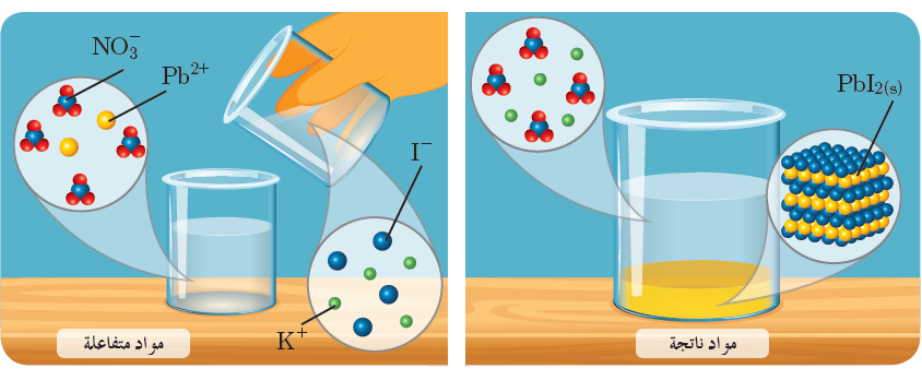 اكتب المعادلة الكيميائيّة المعبّرة عن التفاعل الحاصل بالشكل الجزيئيّ، ثمّ بالشكل الأيوني، ثمّ حدّد نوع التفاعل.