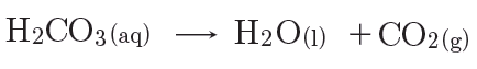 وعند فتح علبة المشروبات الغازية يقل الضغط، ويتفكك حمض الكربون إلى غاز ثنائي أكسيد الكربون، والماء، ويحدث التفاعل وفق المعادلة الآتية: