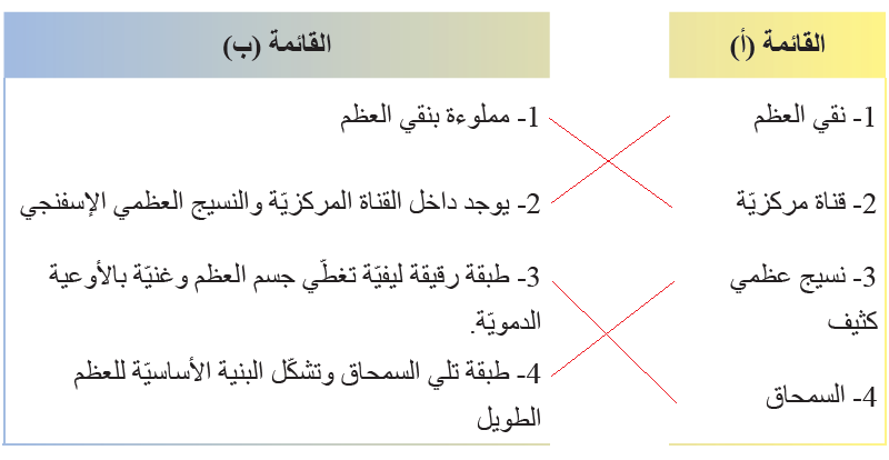 أ- بالاعتماد على المقطع الطولي للعظم أتعاون وزملائي في وصل كل مفهوم علمي من القائمة (أ) مع ما يناسبها من القائمة (ب):