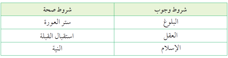 البلوغ – العقل – ستر العورة – استقبال القبلة – الإسلام – النية.