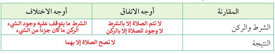 قارن بين الركن والشرط من حيث أوجه الاتفاق والاختلاف، ثم استخلص النتيجة من المقارنة.