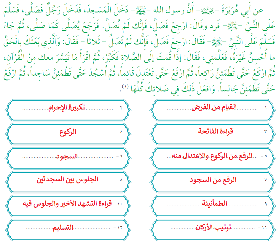 استخرج أركان الصلاة بالترتيب كما وردت في الحديث الشريف.