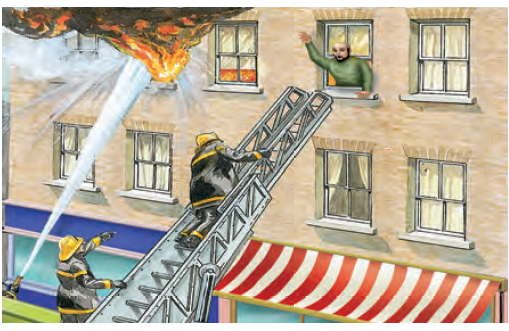إجابة محتملة: حريق في منزل ما، ويظهر شخص من أحد نوافذ المنزل يطلب المساعدة من رجال الدفاع المدني الذين يعملون على إطفاء الحريق.