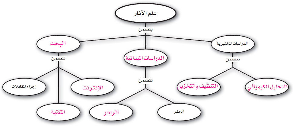 أعد رسم الخريطة المفاهيمية التالية، ثم أكملها مستعيناً بالمفردات الآتية: المكتبة، الدراسات الميدانية، الحفظ والتنظيف، البحث، الإنترنت، الرادار، التحليل الكيميائي.