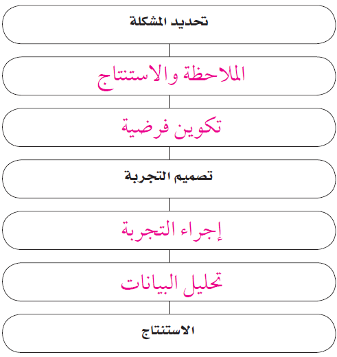 إجراء التجربة، تحليل البيانات، تكوين الفرضيات، الملاحظة.