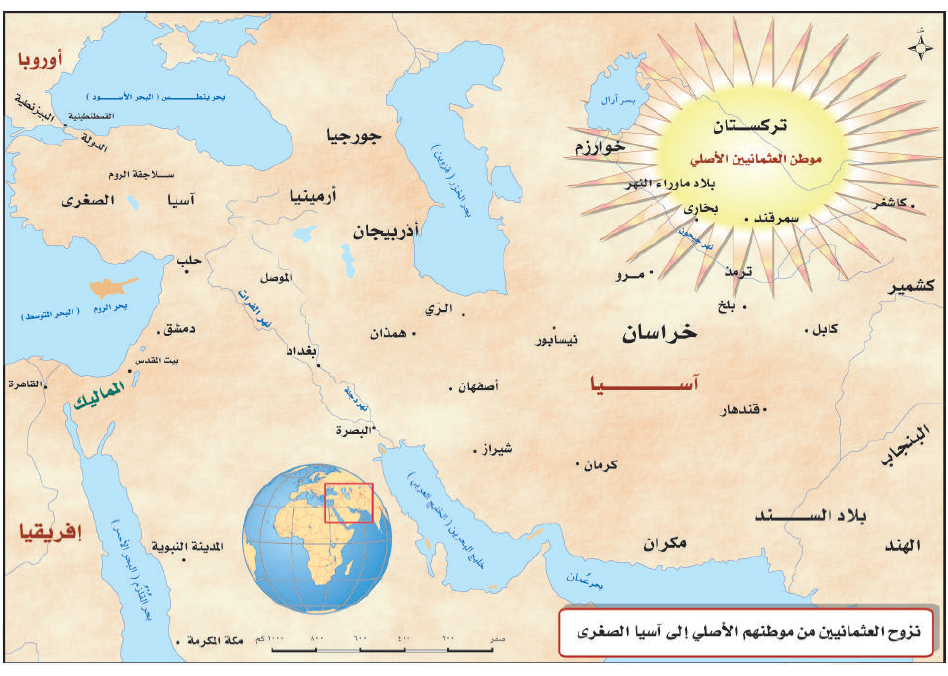 أ- أرسم على الخارطة سهماً يشير إلى اتجاه هجرة العثمانيين من موطنهم الأصلي.