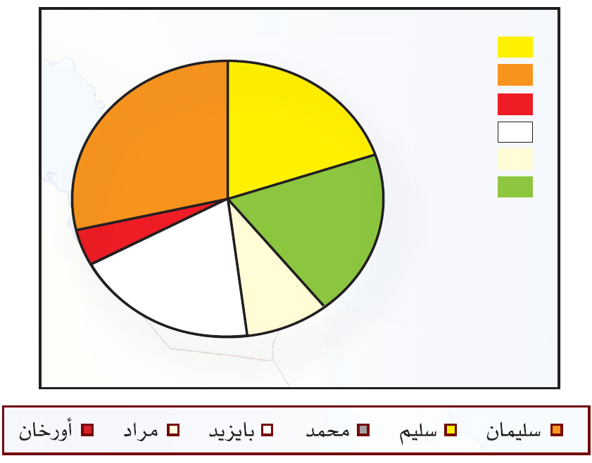 ب- أدون في الدائرة أسماء خلفاء الدولة العثمانية بحسب سنوات حكم كل خليفة.