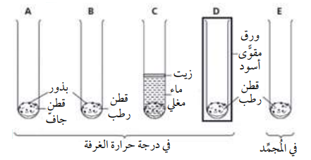 يظهر الشكل المجاور تجربة لدراسة العوامل المؤثرة في إنبات البذور. وضعت الأنابيب (A,B,C,D) في درجة حرارة الغرفة، ووضع الأنبوب E في المجمد (الفريزر)، أجيب عن الأسئلة الآتية: