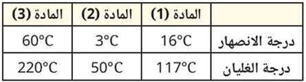 (4) ثلاثة مكعبات من المواد (1) ، (2) ، (3) في درجة حرارة الغرفة والجدول التالي يوضح درجات انصهارها وغليانها: