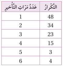 أجرت إحدى المدارس مسحًا لتحديد عدد المرات التي تأخر فيها الطلبة في الوصول إلى المدرسة خلال أسبوع، وكانت النتائج كما هو مبين في الجدول المجاور.