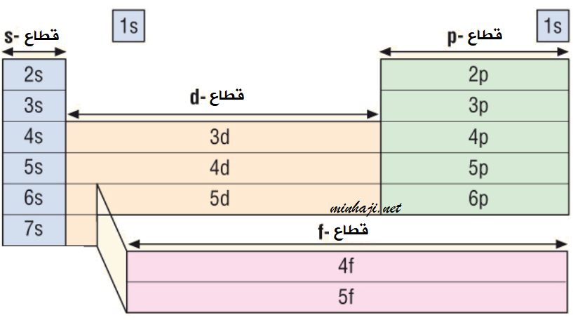 - قطاع f : ويضم العناصر التي ينتهي توزيعها الإلكتروني بالغلاف الفرعي f .