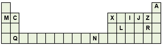 الشكل الآتي يمثل جزءاً من الجدول الدوري ويتضمن رموزاً افتراضية لبعض العناصر. ادرس هذا الجدول ثم أجب عن الأسئلة التي تليه:
