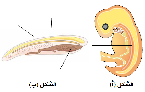 الشكل التالي يمثل نموذجان للحبليات في المراحل التكوينية الأولى، النموذج (أ) لجنين، والنموذج (ب) ليرقة. ادرس الشكل ثم أجب عن الأسئلة التي تليه: