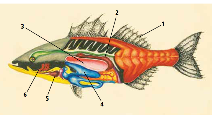 الشكل التالي يمثل التركيب الخارجي والداخلي لسمكة عظمية. ادرس الشكل ثم أجب عن الأسئلة التي تليه: