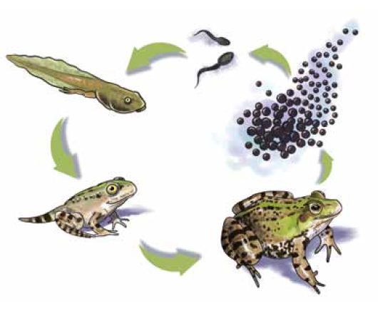 ادرس دورة حياة الضفدع الآتية، ثم أجب عن الأسئلة التي تليها، علماً بأن الماء ضروري لدورة حياته منذ لحظة الإخصاب: