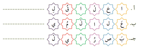 (2) أرتب الحروف في كل سطر مما يأتي لأكون ثلاثة من أسماء الله الحسني تدل على عظمته: