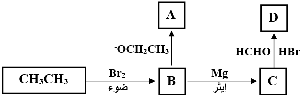 أجريت سلسلة تفاعلات كما هو موضح في المخطط أعلاه لتحضير المركبين العضويين (CH3CH3) ابتداءً من الإيثان D , A ، فإن الصيغة البنائية لهما هي: