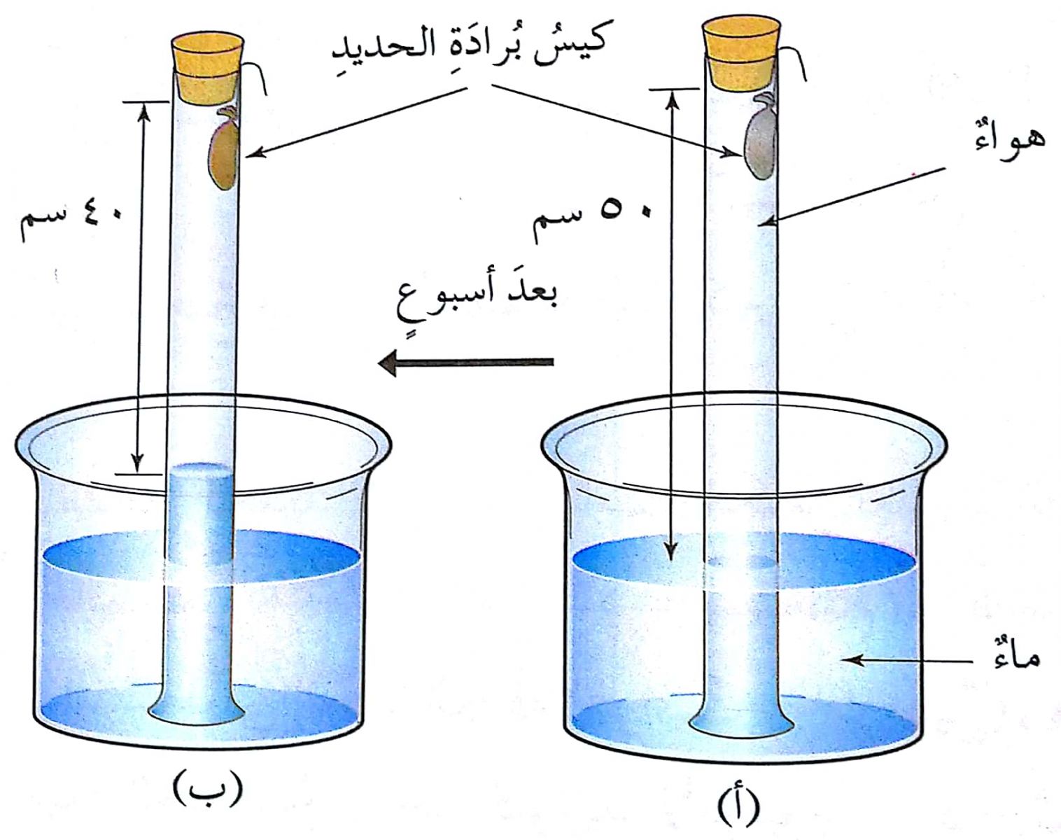 في إحدى التجارب قام طالب بوضع كمية من برادة الحديد في كيسٍ صغيرٍ مسامي، وثبته في الزاوية العليا لأنبوب زجاجي مفتوح الطرفين، ثم أغلق الأنبوب من الأعلى وأوقفه في حوضٍ مائي، وترك الأنبوب لمدة أسبوع. فوجده كما في الوضع (ب) من الشكل المرفق. أجب عن الأسئلة الآتية المتعلقة بهذه التجربة: