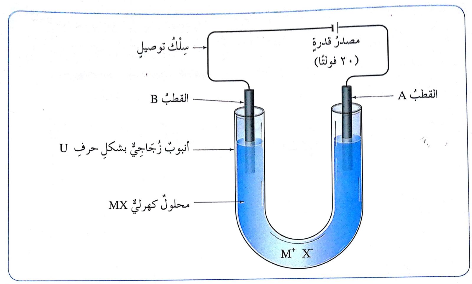 د- أي الأيونات (M+ ، X-) يتحرك نحو القطب (A) وأيهما يتحرك نحو القطب (B)؟