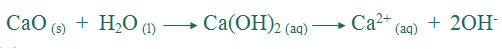 انظر إلى معادلة تفاعل أكسيد الكالسيوم (الجير الحيّ) مع الماء، وتفكك الهيدروكسيد الناتج في الماء.