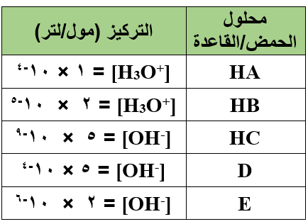 يبين الجدول أدناه قيم تركيز H3O+ و تركيز OH- في محاليل حموض وقواعد افتراضية متساوية التركيز: