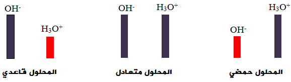 وفي هذه الحالة يكون المحلول حمضياً لأن [H3O+] > 1 × 10-7 مول/لتر.