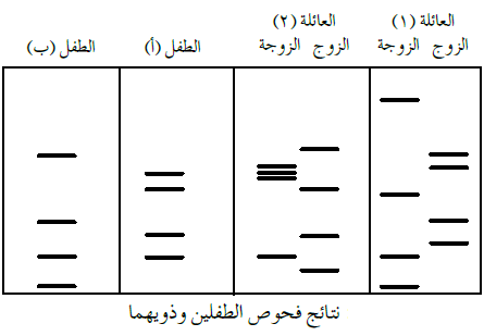 وضعت سيدتان في غرفة الولادة طفلين ذكرين. وقبل وضع السوارين حول معصم كلٍّ من المولودين للتعريف بهما، سُمِع صوت جرس إنذار الحريق لإخلاء جناح الولادة، فأسرعت الممرضات لنقل الطفلين من دون تحديد هويتهما. وبعد زوال الخطر أُجري فصل كهربائي هلامي لعيِّنات أُخذت من الطفلين وذويهما لتحديد بصمة (DNA) لكلٍّ منهم. ادرس النتائج المُبيَّنة في الشكل ثم انسب كل طفل إلى عائلته.