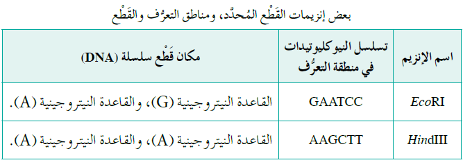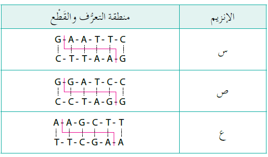 يُبيِّن الجدول الآتي مناطق التعرُّف والقَطْع لإنزيمات مختلفة:
