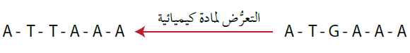 ادرس الشكل الآتي الذي يُبيِّن تسلسل النيوكليوتيدات في جزء من سلسلة (DNA) قبل التعرُّض لمادة كيميائية وبعد التعرُّض لها: