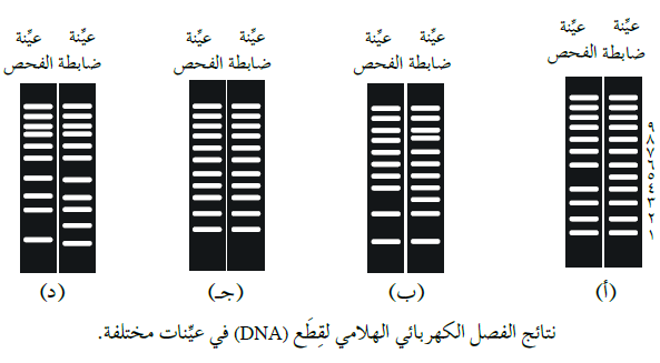 يُشخَّص أحد الاختلالات الوراثية بغياب قِطَع من (DNA)، ويظهر في الشكل نتائج الفصل الكهربائي الهلامي للعيِّنة (أ) مقارنة بعيِّنة ضابطة. وقد أثبتت النتائج عدم وجود القطعة (5) في العيِّنة (أ)، وهو ما يدل على وجود اختلاف وراثي لدى صاحبها.