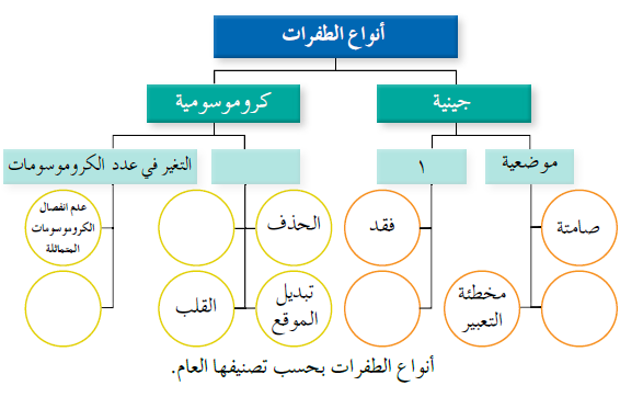 أكمل الشكل الذي يُمثِّل خريطة مفاهيمية تُبين أنواع الطفرات بحسب تصنيفها العام.
