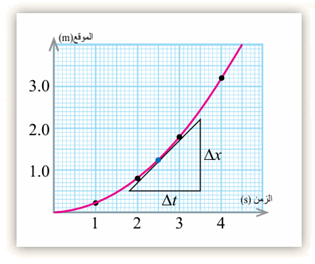 أمثل بيانياً العلاقة بين الزمن والموقع، ثم أجد السرعة اللحظية عند اللحظة (t = 2.5 s).