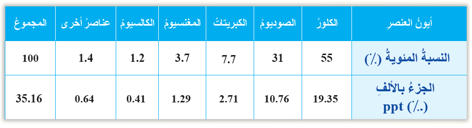 يمثل الجدول الآتي أيونات العناصر الرئيسة الذائبة في مياه المحيطات (بالنسبة المئوية وبالجزء من ألف)، أدرس الجدول ثم أجيب عن الأسئلة التي تليه: