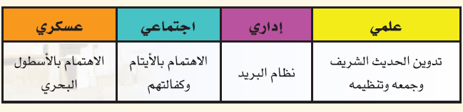 (الاهتمام بالأيتام، نظام البريد، الاهتمام بالأسطول البحري، الأمر بتدوين الحديث الشريف).