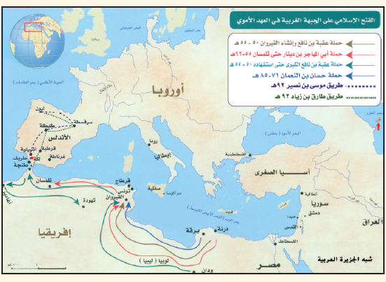 - أرسم سهماً باللون الأخضر تمثل خط سير الفتح في شمال إفريقيا.