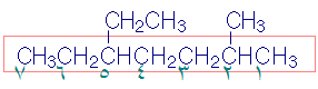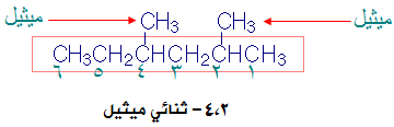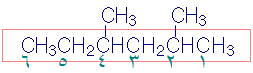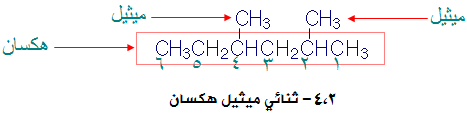 - إذا احتوت السلسلة على أكثر من تفرع متشابه، اكتب أرقام ذرات الكربون المرتبطة بالتفرعات ثم كلمة ثنائي أو ثلاثي أو رباعي ... حسب عددها، ثم اسم التفرع.