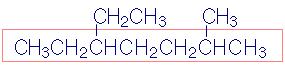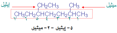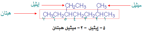 - إذا احتوت السلسلة على أكثر من تفرع مختلف، سم كل تفرع مسبوقاً برقم ذرة الكربون المرتبطة به، ويتم البدء بتسمية التفرعات هجائياً باللغة الإنجليزية. مثلاً تسمى مجموعة الإيثيل (CH2CH3) قبل مجموعة الميثيل (CH3).