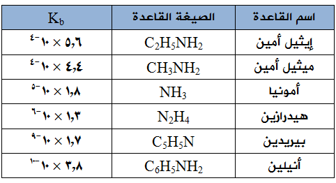 يبين الجدول التالي قيم ثوابت التأين (Kb) لبعض القواعد الضعيفة عند درجة 525س، ادرس الجدول ثم أجب عن الأسئلة التي تليه: