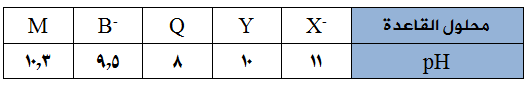 يبيّن الجدول الآتي عدداً من محاليل القواعد الافتراضية الضعيفة متساوية التركيز (0,1) مول/لتر وقيم pH لها، ادرسه ثمّ أجب عن الأسئلة التي تليه: