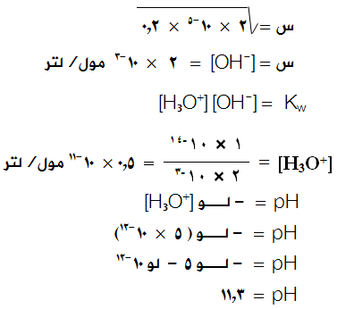 - محلول N2H4 تركيزه (0,01 مول/لتر). (Kb = 1 × 10-6)