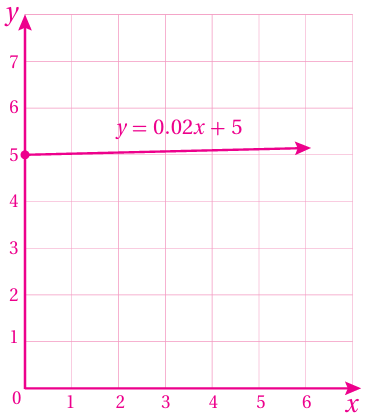 المقطع y يساوي JD 5 ويمثل تكلفة الشحن الشهري دون إجراء مكالمات. والميل 0.02 يمثل تكلفة التحدث لمدة دقيقة واحدة وهو معدل ثابت.