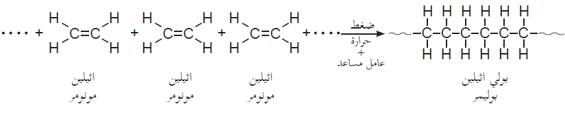 تتم بلمرة الإيثيلين (CH2=CH2) بالإضافة بمفاعلة عدد كبير من جزيئات الإيثيلين، وبتأثير الضغط والحرارة ووجود العامل المساعد تنفك الروابط الثنائية وترتبط جزيئات الإيثيلين ويتكون بوليمر البولي إيثيلين.