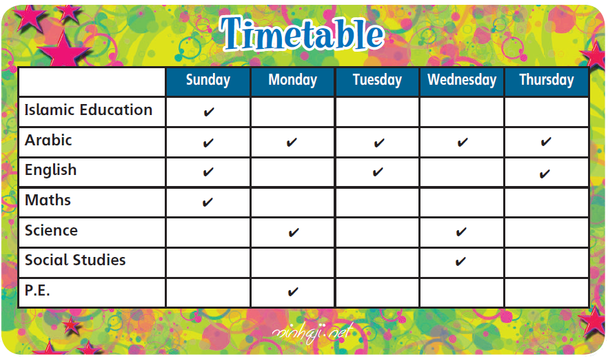 This is my timetable! On Sunday, we always have Islamic Education and Maths. On Monday, we have P.E. We have Arabic every day. We have English on Sunday, Tuesday and Thursday. On Wednesday, we have Social Studies. Social Studies is my favourite subject! We have Science on Monday and Wednesday. My favourite day is Thursday because we go to the library and read books.