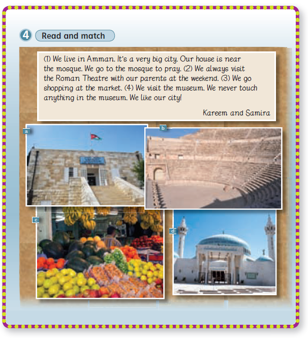 - We live in Amman. It’s a big city. Our house is near the mosque. We go to the mosque to pray. (d)