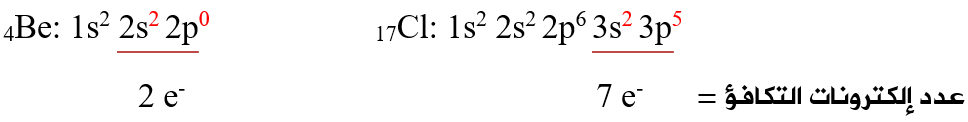 عدد إلكترونات التكافؤ الكلي = (عدد إلكترونات تكافؤ Be × عدد ذراته) + (عدد إلكترونات تكافؤ Cl × عدد ذراته)