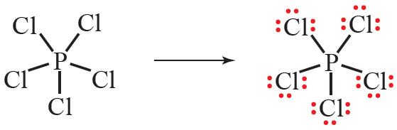 لاحظ أن قاعدة الثمانية انطبقت على ذرات الكلور ولم تنطبق على ذرة الفسفور، وأن عدد أزواج الإلكترونات حول ذرة الفسفور أكثر من (8).