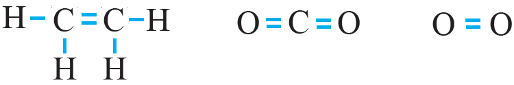 جزيء الأكسجين O2 ، وجزيء ثاني أكسيد الكربون CO2 ، وجزيء الإيثين C2H4 .