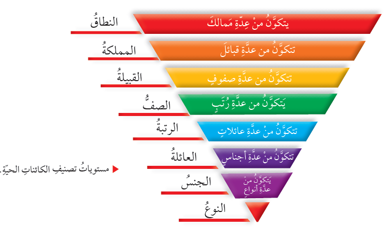تبدأ مستويات التصنيف بالنوع (الوحدة الأساسية في التصنيف)، وتنتهي بالنطاق.