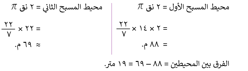 مسبحان قاعدتهما دائريتا الشكل، الأول نصف قطر قاعدته 14 مترًا والثاني طول قطر قاعدته 22 مترًا، ما الفرق بين محيطيهما؟